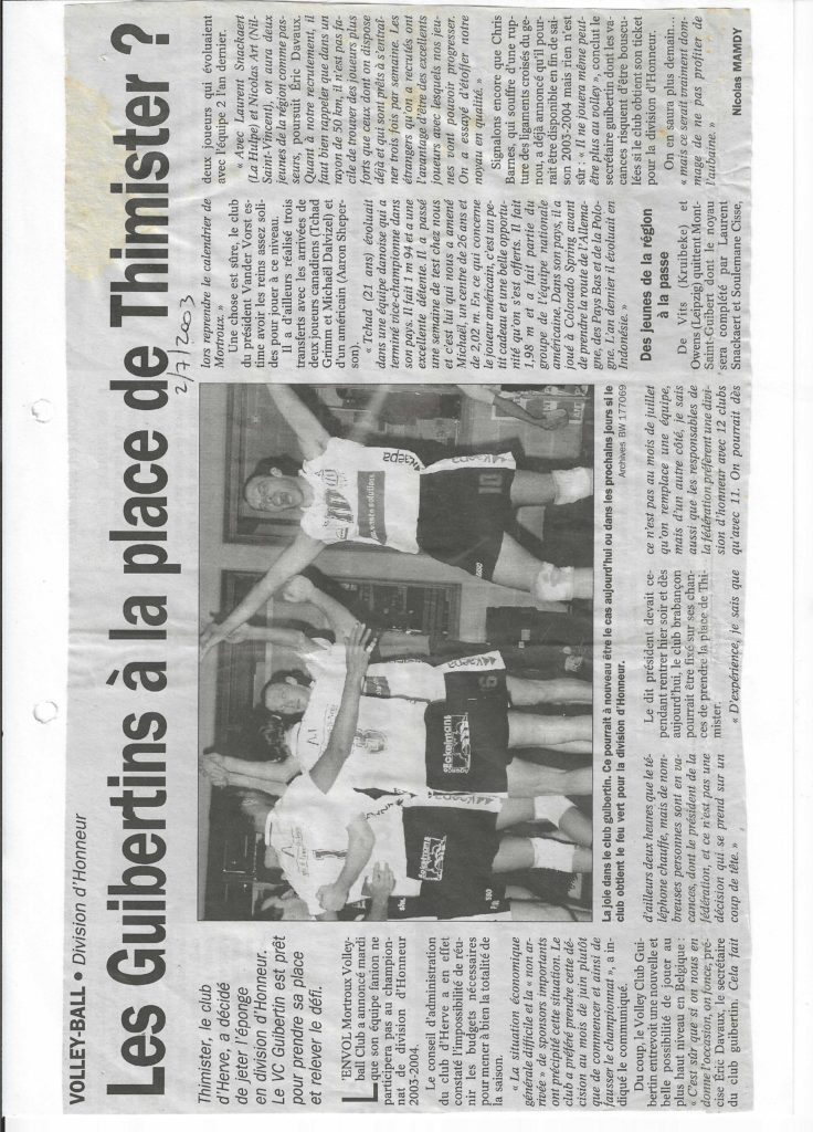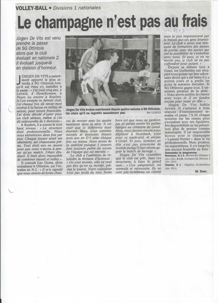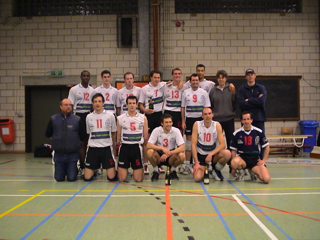 La saison 2002-2003 est une saison historique pour le club. En espérant remporter toutes les rencontres au deuxième niveau belge composée, à l’époque, de 2 séries de 12 équipes. le club n’était pas spécialement favori de sa série. Sous la conduite de Koen Hoeyberghs, l’équipe engrangea des succès, mais aussi quelques défaites. Cependant, la régularité et la terrible bagarre entre les équipes de tête propulsa le groupe en tête de la série avec un titre de champion. Mais il fallait encore battre le champion de l’autre série, Eisden où les frères Van Walle étaient au début de leur brillante carrière.