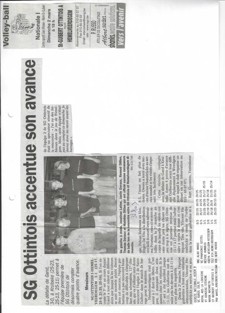 Le même samedi, aussi à Vilvorde, et quatre heures avant l’équipe fanion, la deuxième équipe, entrainée par Bart Goossens, jouait aussi un barrage pour son maintien en Nationale 1. Car le club présentait la particularité d’avoir 2 équipes au même niveau, dans l’antichambre de l’élite. Avec un Damien Gaussin, virevoltant, tout en venant de la 3èmeéquipe, notre équipe battit Hemelveerdegem et se maintenait à ce niveau.