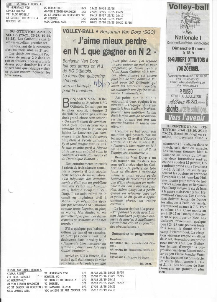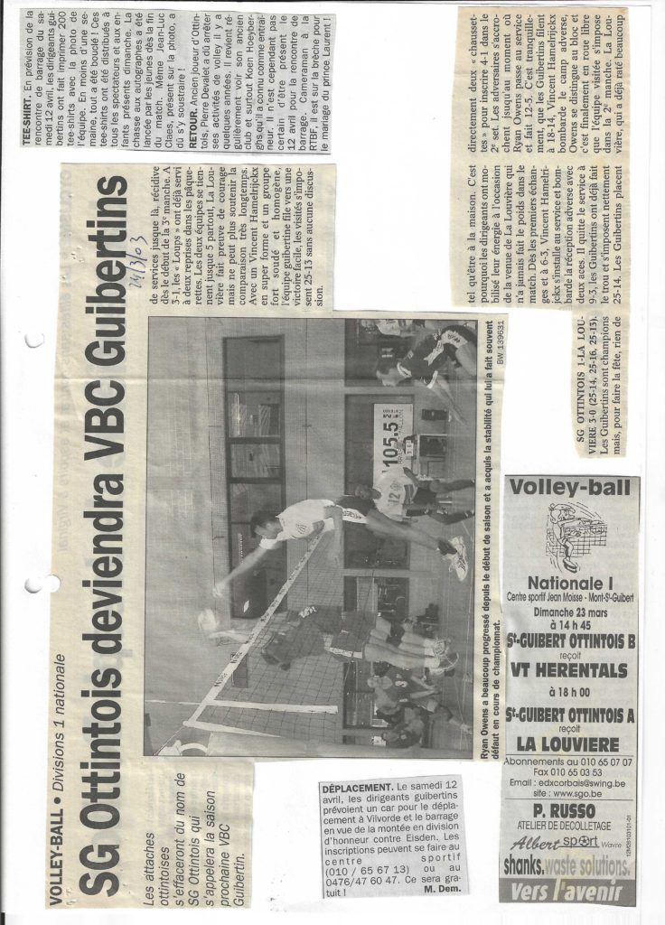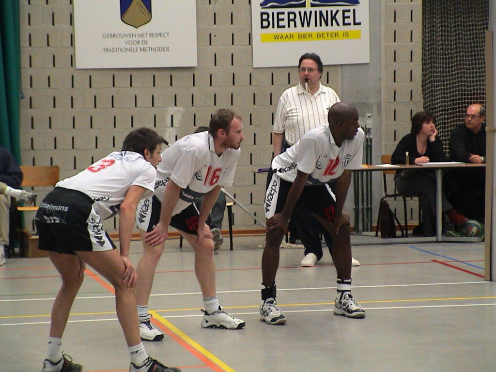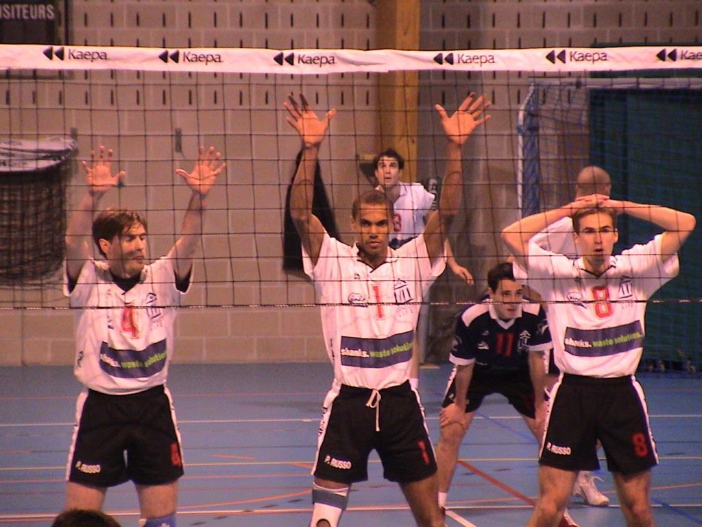 Ce barrage se joua en terrain neutre, à l’EVC de Vilvorde. Un premier set remporté malgré la grave blessure du central Chris Barnes. Il fut remplacé pour la suite de la rencontre par Laurent Malisoux qui se démerda tant bien que mal malgré le fait qu’il soit un pur attaquant réceptionneur.  Malheureusement, l’équipe s’inclina 3-1 laissant aux Limbourgeois la place au sommet du volley belge. Mais il y avait encore une chance avec le barrage le lendemain face à l’avant-dernier de l’élite, Kapellen.