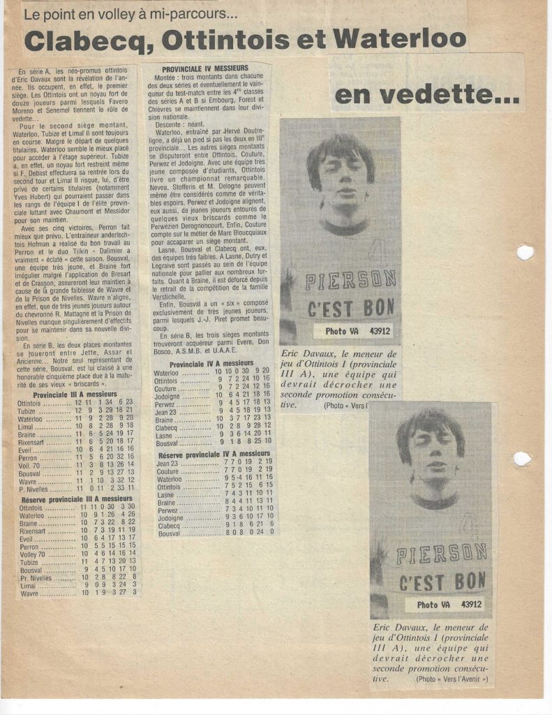Provinciale 3 : Pierre Brahy (18), Nicolas Crabbé (20), Joseph Damoczi (25), Eric Davaux (24), Marc Delogne (20), Robert Delogne (23), Claude Devuyst (27), Moreno Favero (27), Jean Fiasse (18), Daniel Fransen (18), Pierre Piret (17), Nuri Senemek (29), Yves Tombus (21).  Entraîneur : Maurice Baugniet.  Deux entraînements par semaine, le mardi (Coquerées) et le jeudi (Blocry).