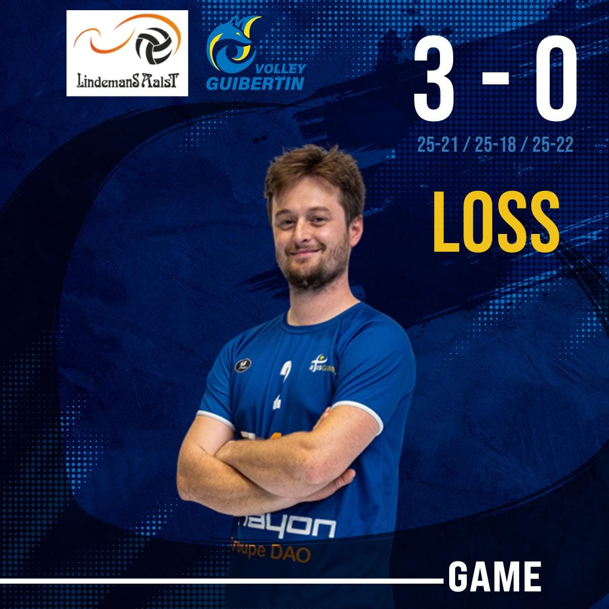 Ligue A : Lindemans Aalst 3-0 Volley Guibertin 11 décembre 2023News Défaite de la ligue A samedi soir à Lindemans Aalst 3-0. L'équipe finit 5ème la première partie de saison, à 2 points de la 2ème place et à 3 points de la 7ème place dans un championnat très serré !