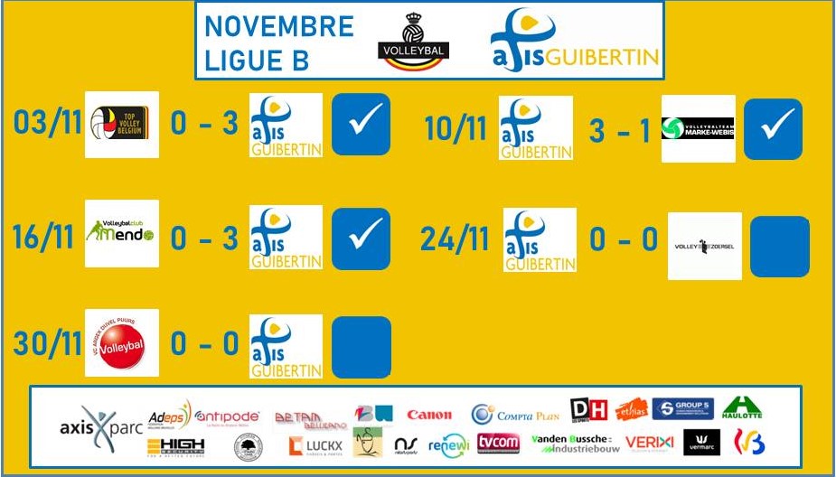 Un sans faute pour le moment en ce mois de novembre ! 24 novembre 2019News Notre équipe fanion poursuivra-t-elle sur sa belle lancée ce soir face au VC Zoersel ? Réponse dès 18:00 !